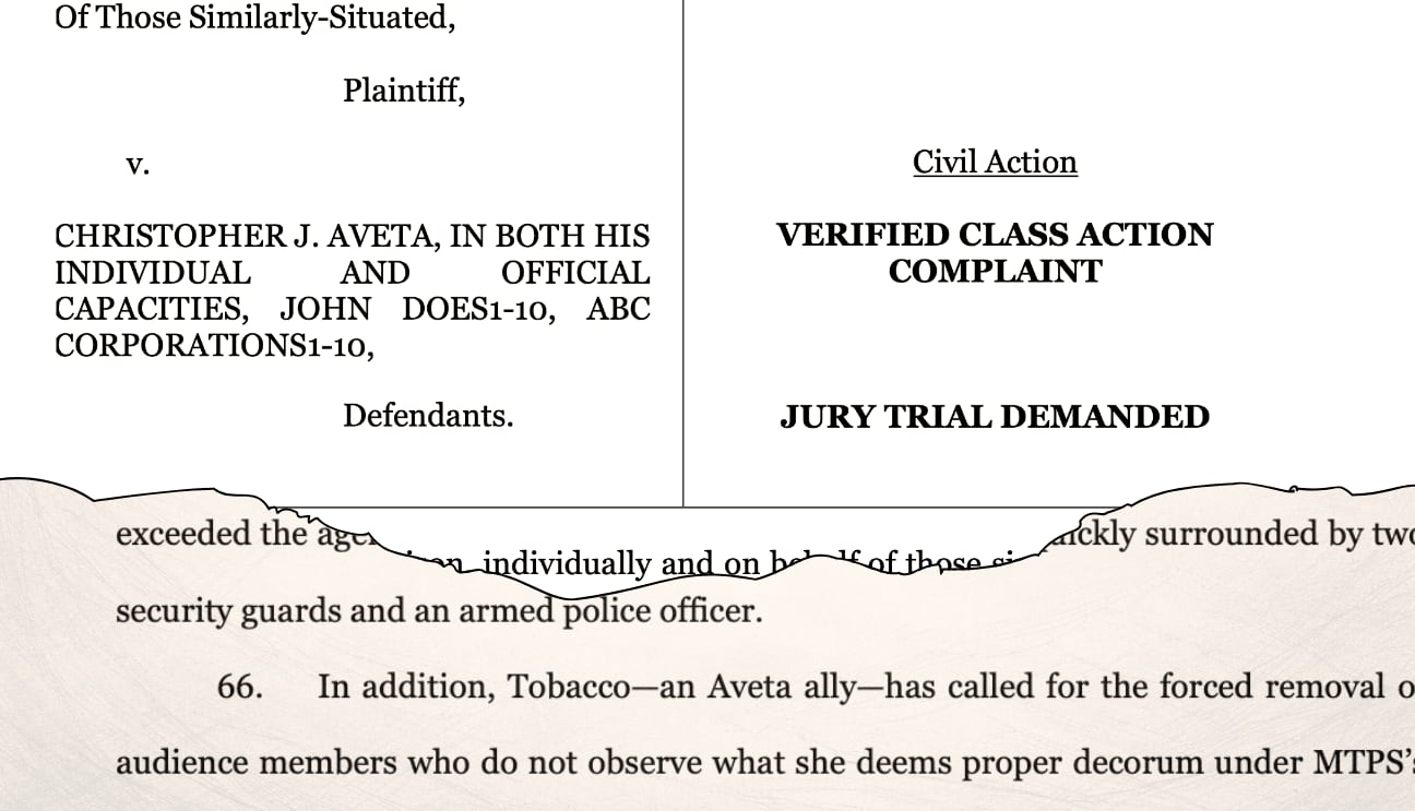 A Middletown resident has filed a federal lawsuit against Christopher Aveta, president of the Middletown Township Board of Education, seeking emergency relief to block what the complaint describes as a requirement that public speakers disclose “group affiliation” before commenting at board meetings.